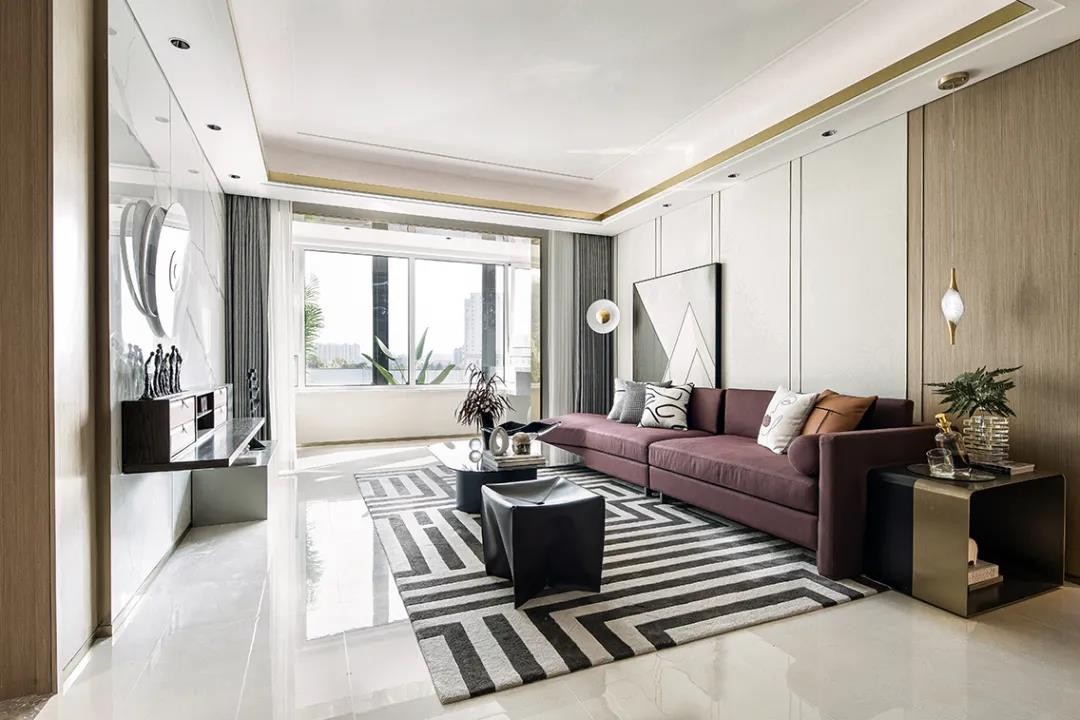 客厅采用白杨木墙壁塑造温和的氛围,使空间可以尽情感受光线性质的变化。搭配经典几何线条的地毯和简约的装饰画,拉开层次感的同时提升了质感。