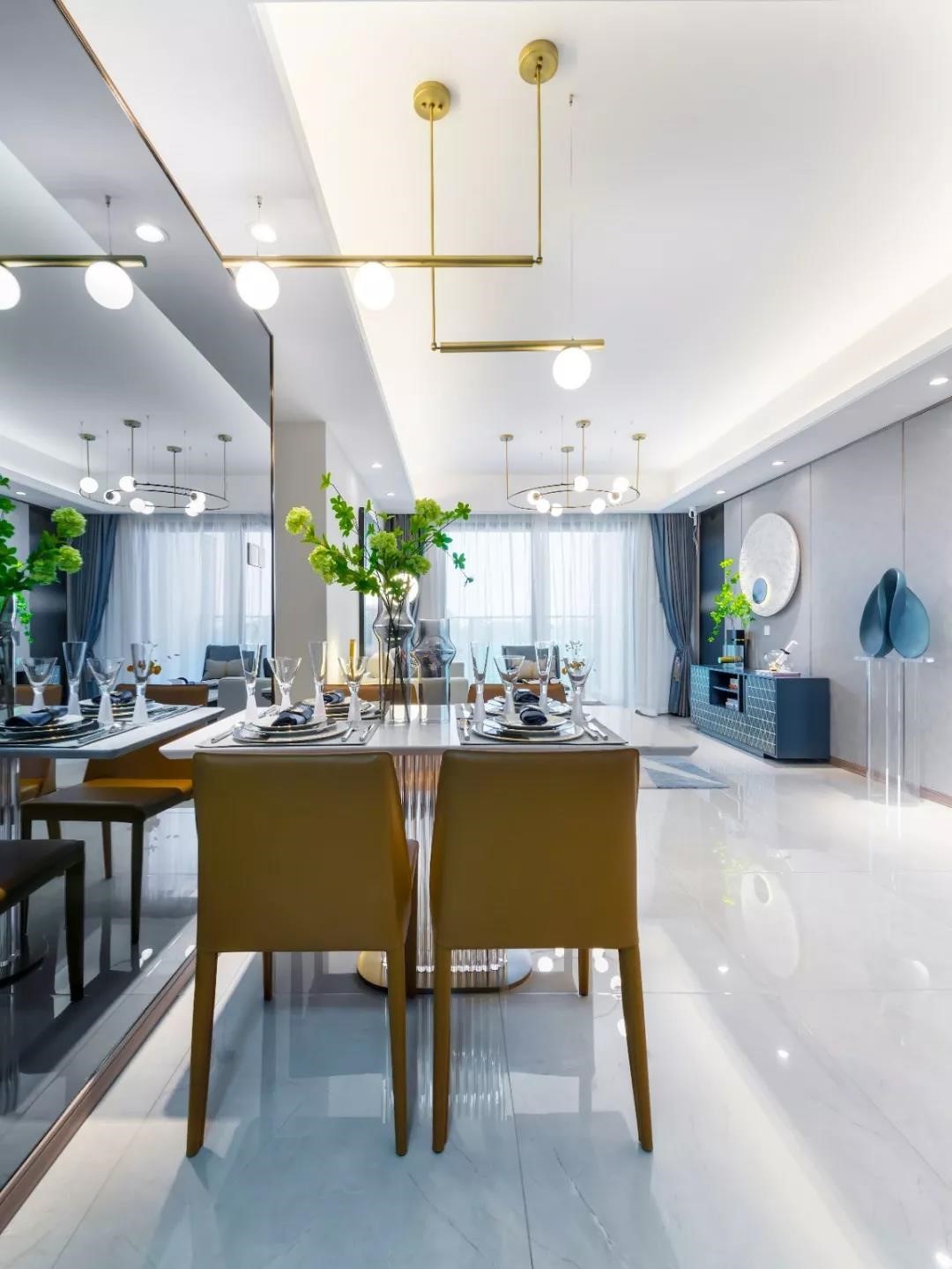 雾蓝色的电视柜点缀金色几何线条,呈现出奢华的细节,经典与时尚兼具