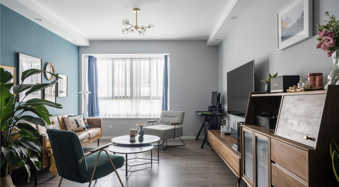 原有的地板是枫叶红,复古北欧风并不合适,颜色太跳了,并且使用的时间也很久了,地板很多也起鼓变形了,所以地板重新铺了黑胡桃木地板。 2/原来的阳台直接敲掉和客厅连体,扩大了客厅的面积,光线通透的同时,搭配原木和皮质姜黄沙发,对比原来的装修,更有质感,复古北欧风格也更有韵味。 3/在原有的精装修天花基础上增加了风管机。 4/墙身刷了灰色和雾霾蓝(品牌:大师) 5/软装上,业主基本上都时由设计者把控,业