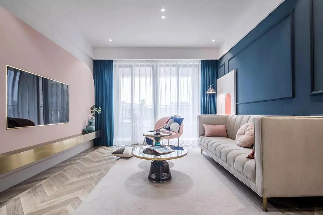 客厅空间的配色大胆优雅,粉色的电视墙与深蓝色的沙发墙,大胆的对比色调相互撞击,带来了一种优雅的高档与时尚气质,现代简约的家居布置,也显得更加轻松舒适。沙发墙在深蓝色的基础,加入边框造型,布置优雅舒适的布艺沙发,也呈现出一种闲适轻松的居住体验。