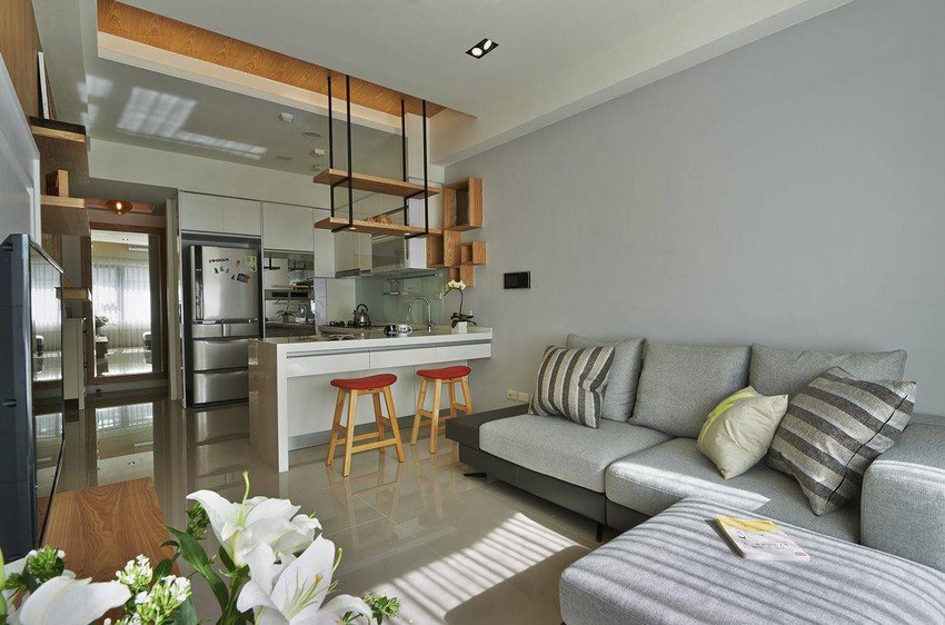 透过简约的线性表情,传递适切的居住温暖,空间仿佛回归了纯粹的生活机能。木质框定的大片穿衣镜面于玄关处有效延续采光,预告空间的材质表现,同时藏起电箱的位置。大跨距的钢刷木皮立面,以白色线板框作为电视主墙,材质的堆衬创造立体的视觉层次。