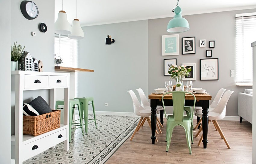 利用屋主喜爱的薄荷绿贯穿整个空间,不但极具个人特色,还充满了小清新的文艺气息。利用十分具有包容性的灰白色为空间的基底,似乎在灰白色的空间里任何色彩都不会显得突兀。薄荷绿色的餐椅,同色系的吊灯,靠垫,装饰画,通过一系列的点缀,让空间既整洁舒适又充满令人沁脾的气息。