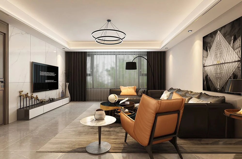 客厅电视背景墙和地板分别采用白色、灰色的大理石,以现代风格家具装饰空间非常时尚大气,米黄色墙面、橙色调、中性色调灯光的运用增加空间的温润感。