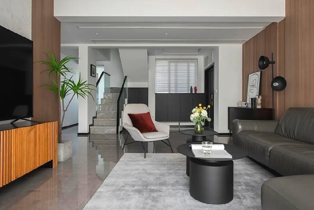 客厅整体氛围比较简约化,但是可以从细节方面设计师用了很多心思,每一处地方都是精心设计。户型是复式的,二楼是卧室,一楼则是客厅,布局十分平整舒适。沙发背后延续空间情绪的前提下,把墙做了立体的处理, 有层次有变化的木质节奏,提升了品质感,有了建筑的语言也不再呆板。电视背景墙则采用云石面,搭配棕色家具显得层次感十足。令整个客厅氛围更加舒适自然。
