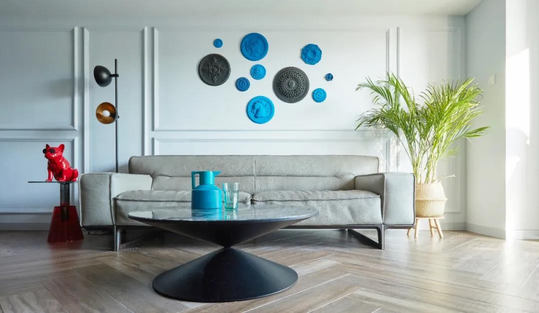沙发背景墙利用简洁的石膏线条勾勒出有趣的肌理,仿佛是与玄关区域隐形墙面的一种对话。来自希腊的壁挂总能让人想到奥利奥饼干,大理石茶几好似一弯湖水,为生活注入甜美和活力。