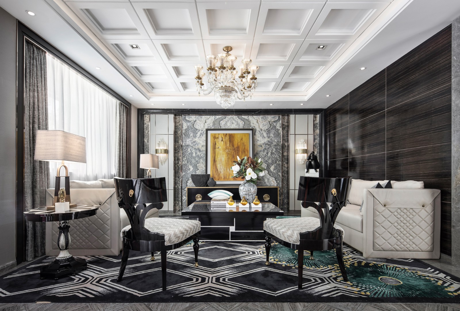 客厅以黑白灰中性色铺展而开的通透视野,缔造出简雅的现代格局,新古典风格的家具造型端稳而雅致,在水晶吊灯的映衬下光韵流转,从容呈现着高贵的气质。