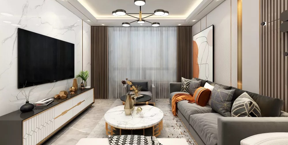 电视墙造型不复杂,大砖配上钛金线条,极尽奢华感