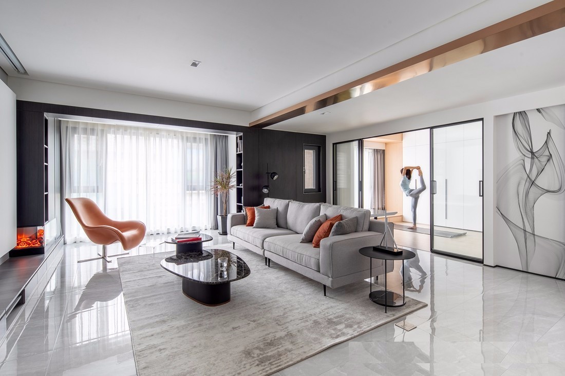 客厅区域,拆除了原本的主卧卫生间,增设为书写空间,扩展了客厅的纵向深度,形成横厅。