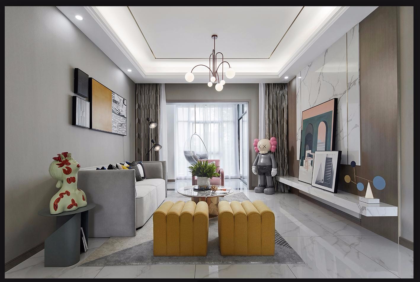 米白质感石材和灰调家具营造现代感,一抹明媚的黄率先闯入眼帘,融入简约几何图形的软装饰品,充满童趣的玩偶形制雕塑,点缀生活写意的绿植。时光正好,从初始运用在光影层次的打造,艺术与空间交织出新的篇章。