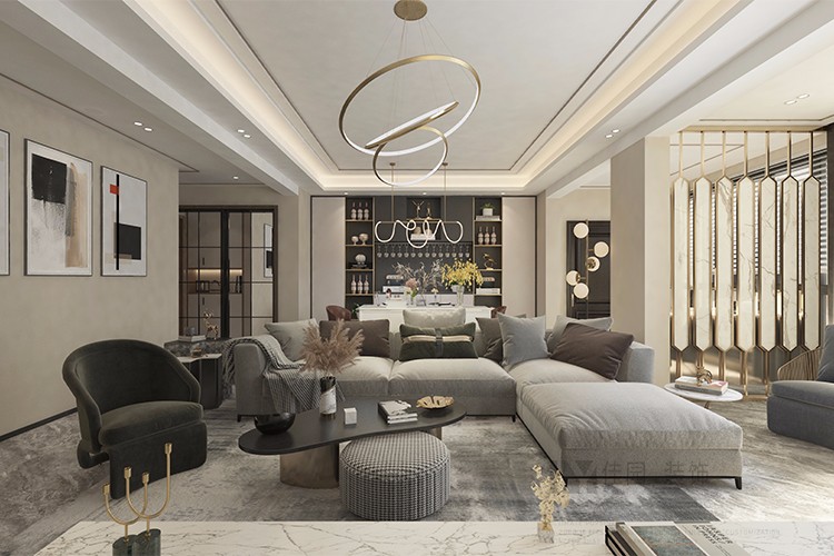 客厅家具方面,建议采用灰色色调和金属元素点缀,营造平静而不失时尚氛围。
