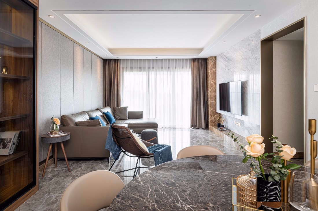 客餐厅整体色调以灰棕色作为主色调,运用了不同的材质质感层次,点缀金色与蓝灰色,使空间统一也跳脱。