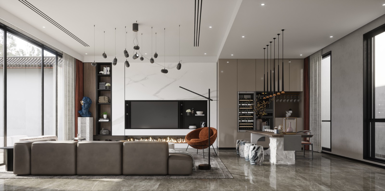 客厅与园林相互环抱,充溢自然景致,我们以「亭」的概念来实现内外环境的因借,将「欣赏园林」视作起居坐卧最为重要的活动。