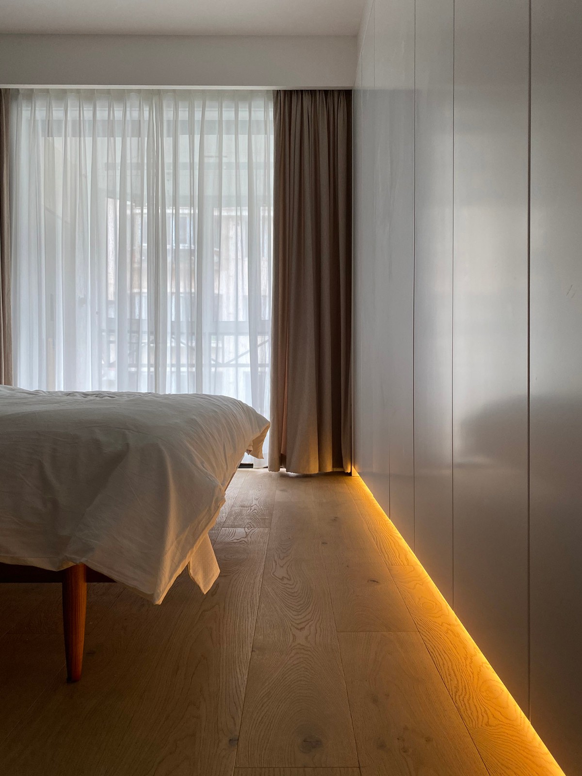 整墙的衣柜保证了衣物收纳需求,衣柜底部暗藏灯光,光的延伸营造出沉浸式氛围