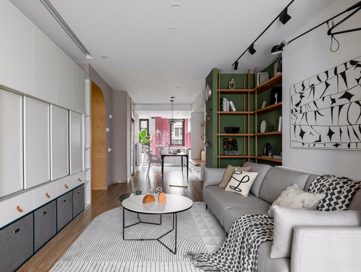 沙发背后利用空间原始凹陷结构,打造一个开放的陈列区,单独跳跃的色彩增加空间的趣味和美观.