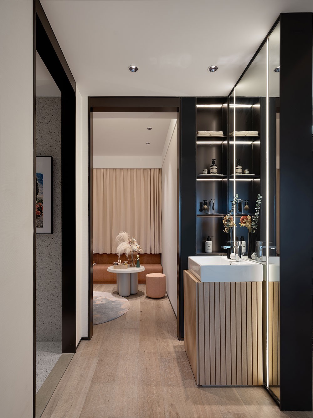 面板之内,两侧分立的健身区和胶片收藏区与中间部分的咖啡收藏区,共同组成了夫妻俩的“爱好小天地”,这里是展示设计的多元的过程。