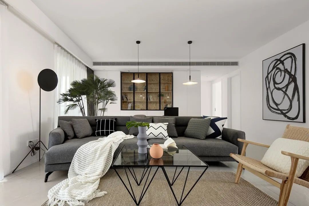 厅的灰色斜角沙发丰富空间造型的同时不妨碍通行,原木色的绳编休闲椅具有天然的亲切感。