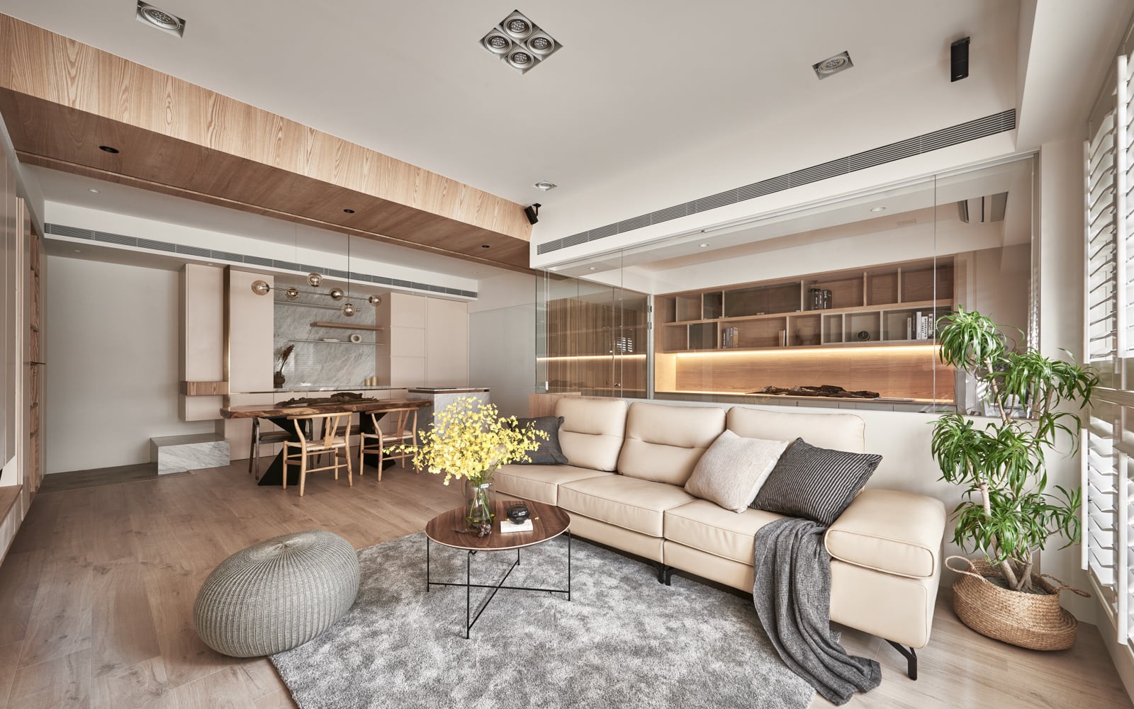 入户玄关设计成一个曲面,曲面的线条同时也柔化了光线和阴影.