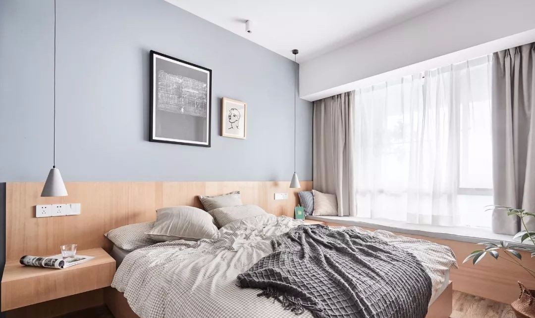 主卧的床头柜、床靠背和飘窗是一体化设计,配合MUJI无靠背收纳床,整体风格清新简约。