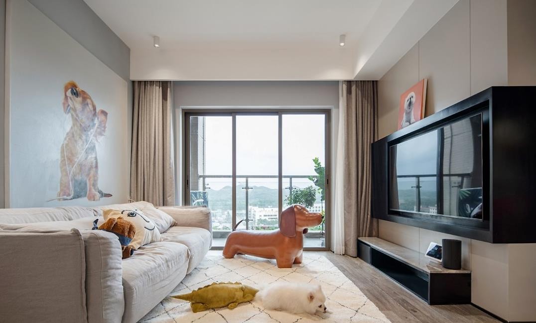 在屋主眼里,狗狗是属于家人般的存在,所以家里的装饰画都是用的狗狗的“形象照”。低饱和的浅灰色背景墙搭配素色的沙发,使得空间更加的整体化,装饰画的色彩冲击更是给客厅增添了一份活力。