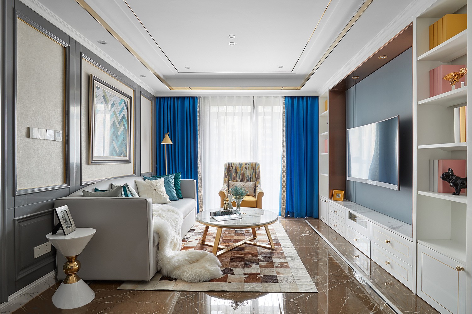 沙发一角配色很丰富,黄色的老虎椅,银色的大沙发,钴蓝色的窗帘,白色的窗纱,都是很好的点缀。