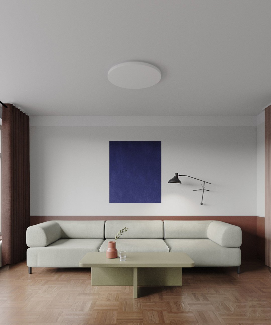 墙面的红棕色墙裙元素衍生至厨房内的橱柜和操作台,形成统一完整的视觉效果,同时厨房门上方的圆洞呼应对面的圆形装饰物。