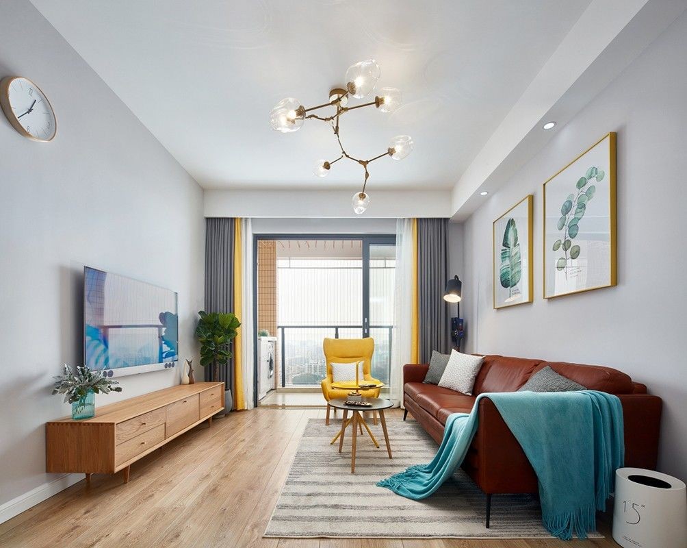 舒适清浅的客厅里,高饱和度的明黄色与湖蓝色提亮了整个空间,感性与理性并存的线条与几何形态共同演绎着独有的居家温度