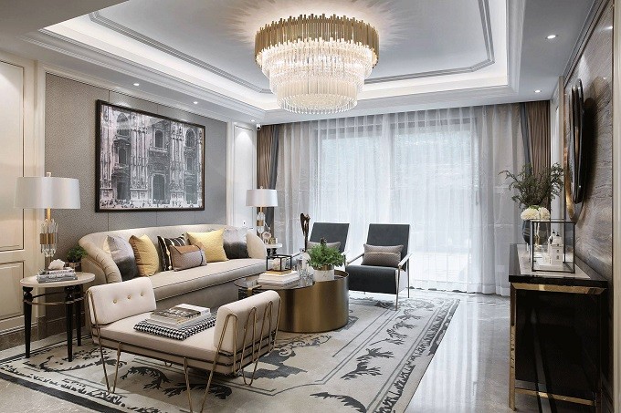 电视背景和沙发背景采用一些简单不浮夸的金属线条,衬托空间的大气感