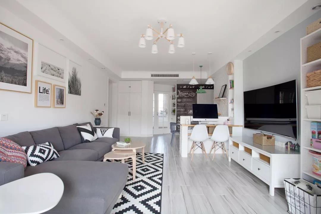 这套案例面积为110㎡,设计风格为北欧。运用简洁的硬装搭配小清新软装,比如大白色背景墙搭配清新绿吊灯、挂上杏色的钟,然后灰色L型沙发在偌大的白色调的空间里也搭出了一个年轻简约的空间,衬托得更加温馨美好的生活氛围。