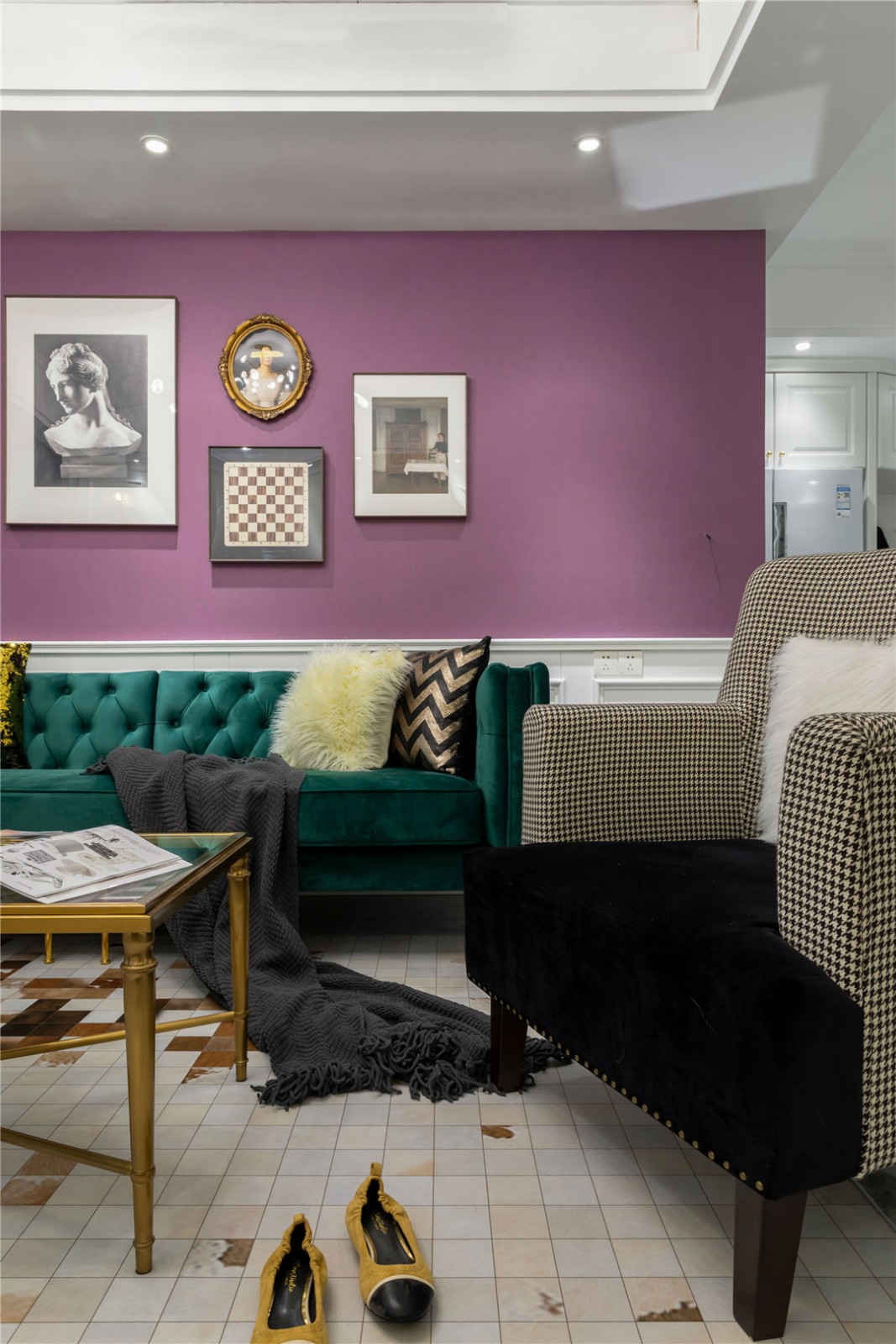 白色的护墙板造型和整体报纸感的墙面,带来复古和年代感。