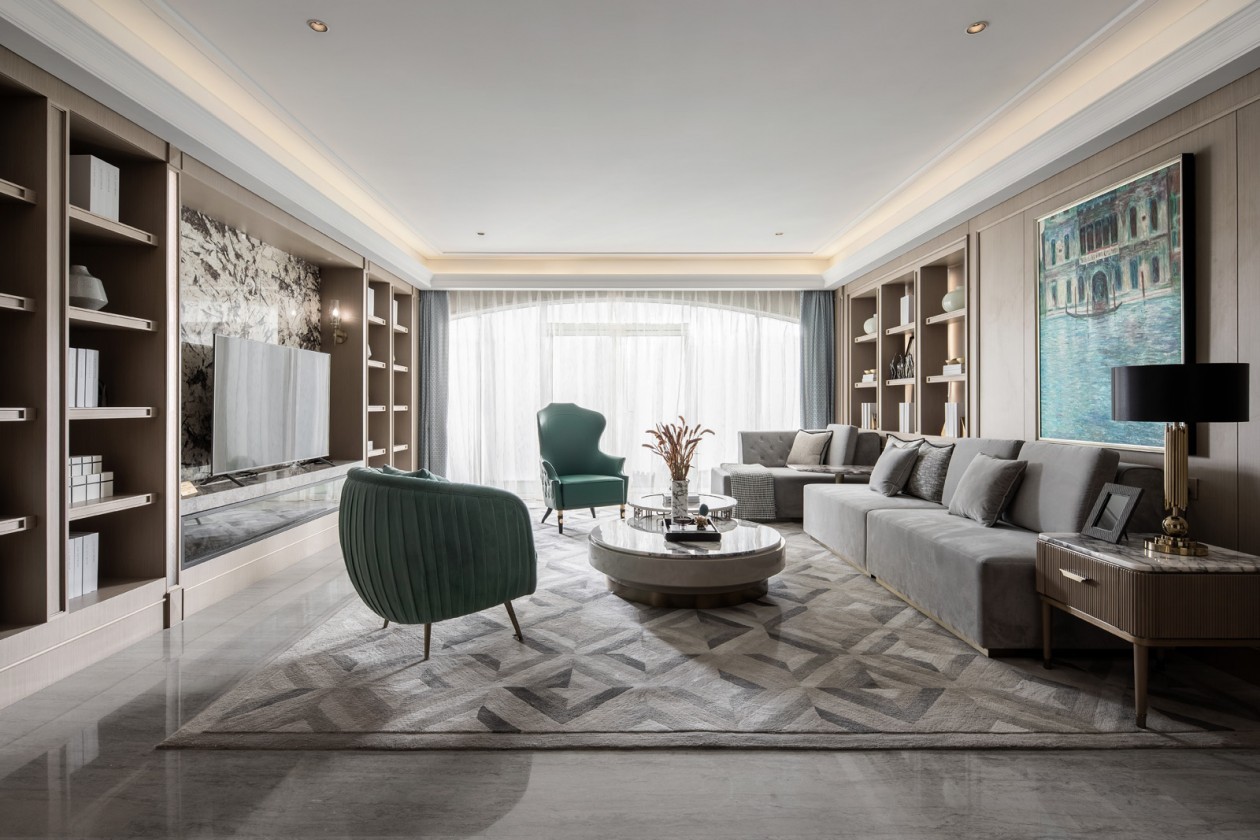 客厅选用***的雪山兰大理石作为电视背景墙 茶几上雅士水波纹理石饰面与其相呼应,清雅的“祖母绿”色单椅与格纹地毯