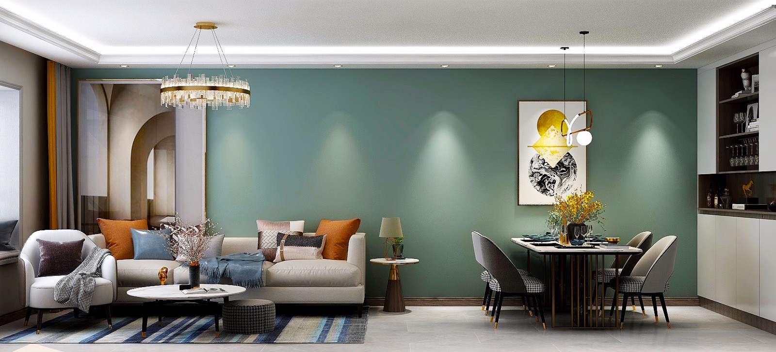 客厅:客厅背景墙采用绿色的乳胶漆造型,让空间显得质感丰富,电视墙瓷砖上墙的效果提亮色调,整体显得明亮、大气。