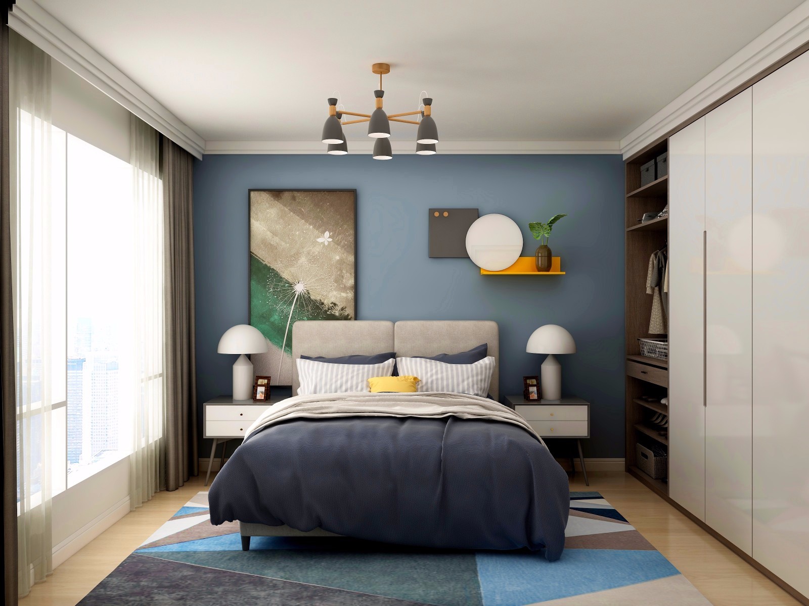 深灰蓝背景墙,增加视觉的距离纵深,蓝色调更助于睡眠。