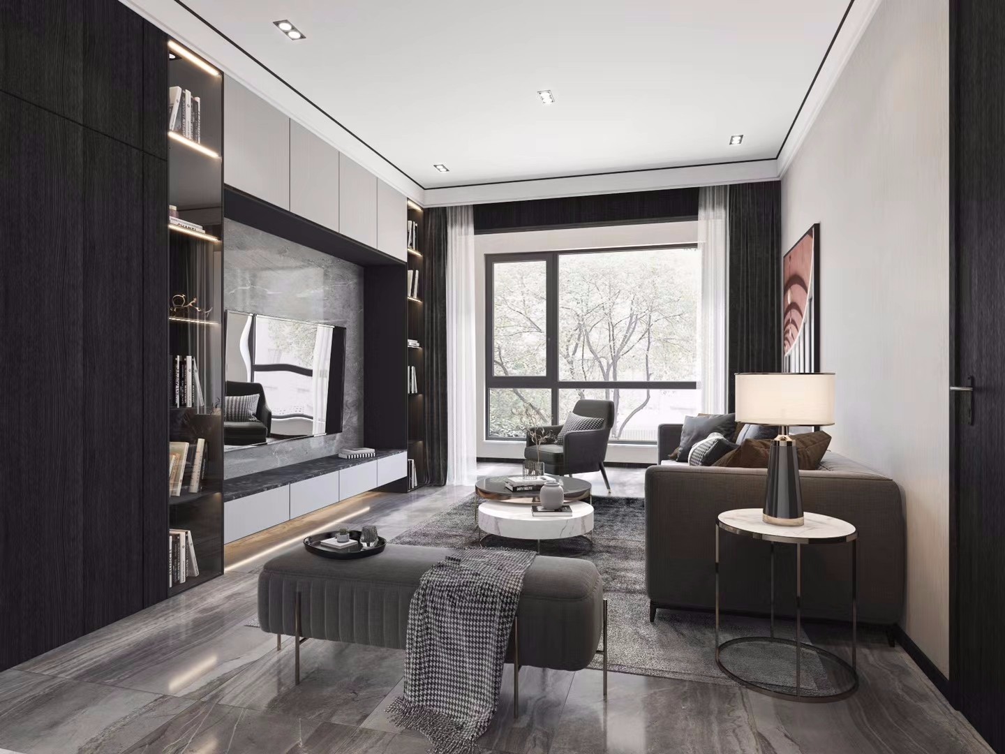 采用后现代风格,电视背景墙做成可以储物的,加大收纳空间