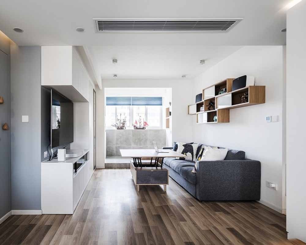 客厅电视柜用白色柜体形成大面色块来区分功能,整体家居都采用黑白灰和咖啡原木色来统一客厅的北欧风格。