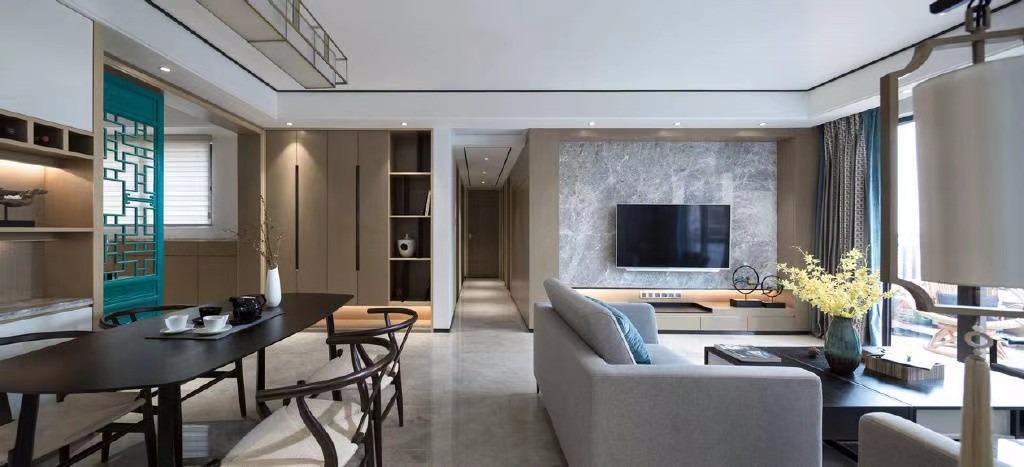 客厅电视背景墙,柜子都采用原木色,电视背景墙使用石材,地砖为灰砖,整体搭配比较和谐统一。