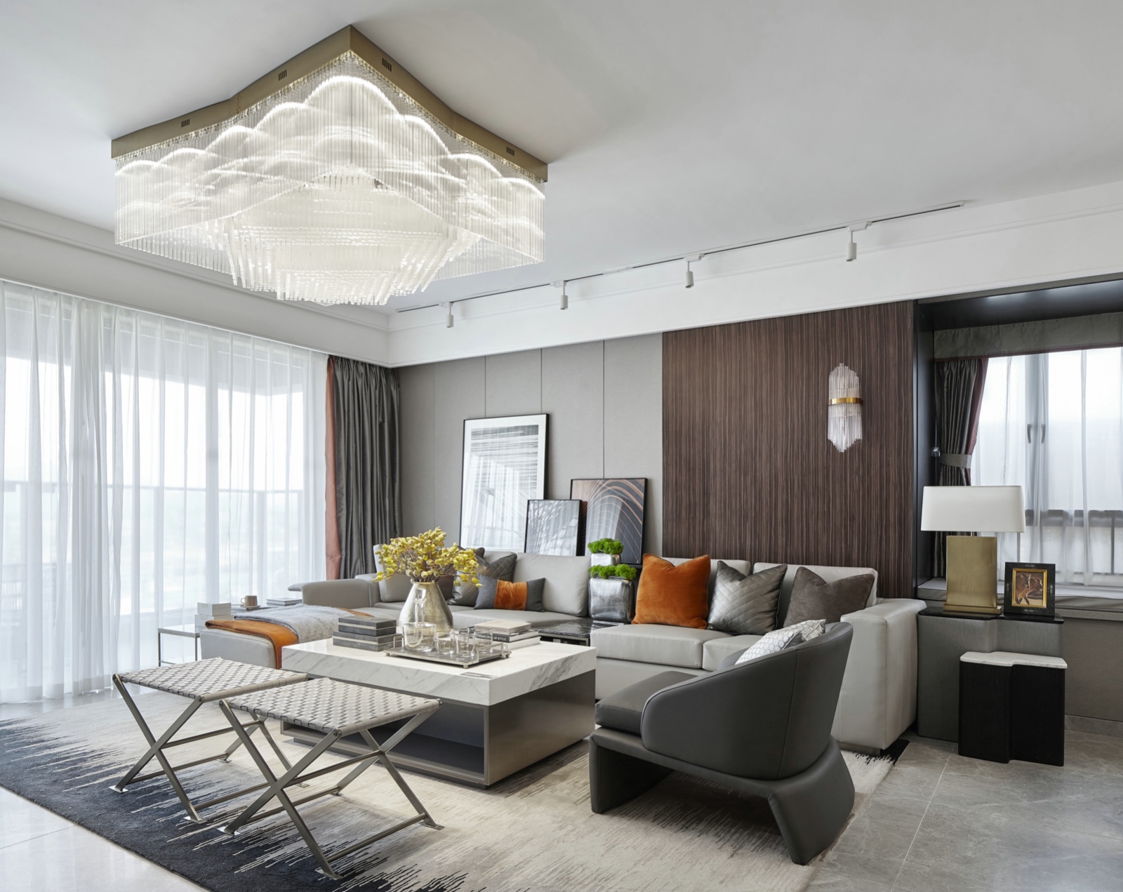 客餐厅一体的格局划分,利用局部吊顶统一空间,主次分明的吊灯装饰区域。