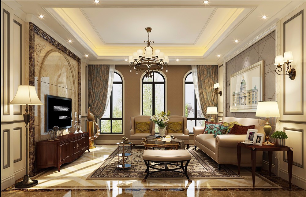 客厅采用简单的吊顶造型,搭配水晶吊灯,营造出怀旧、浪漫的感觉。在沙发茶几区域铺上大幅花纹地毯,使空间区域划分更加清晰。沙发背景墙的装饰及造型使整个空间更加具有美感,让家庭成为和解放心灵的净土。