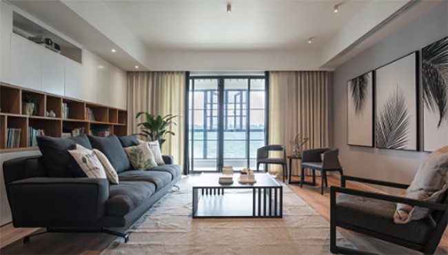 客厅,我们采用对坐的方式,方便交流,透过落地窗,我们可以看到绿树丛荫