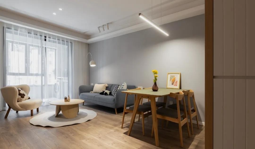 玄关进来即是客餐厅,通铺木地板,墙面为浅灰色,客厅区域顶面采用平层无主灯设计,自然优雅、温馨舒适,正是屋主想要的家的感觉。