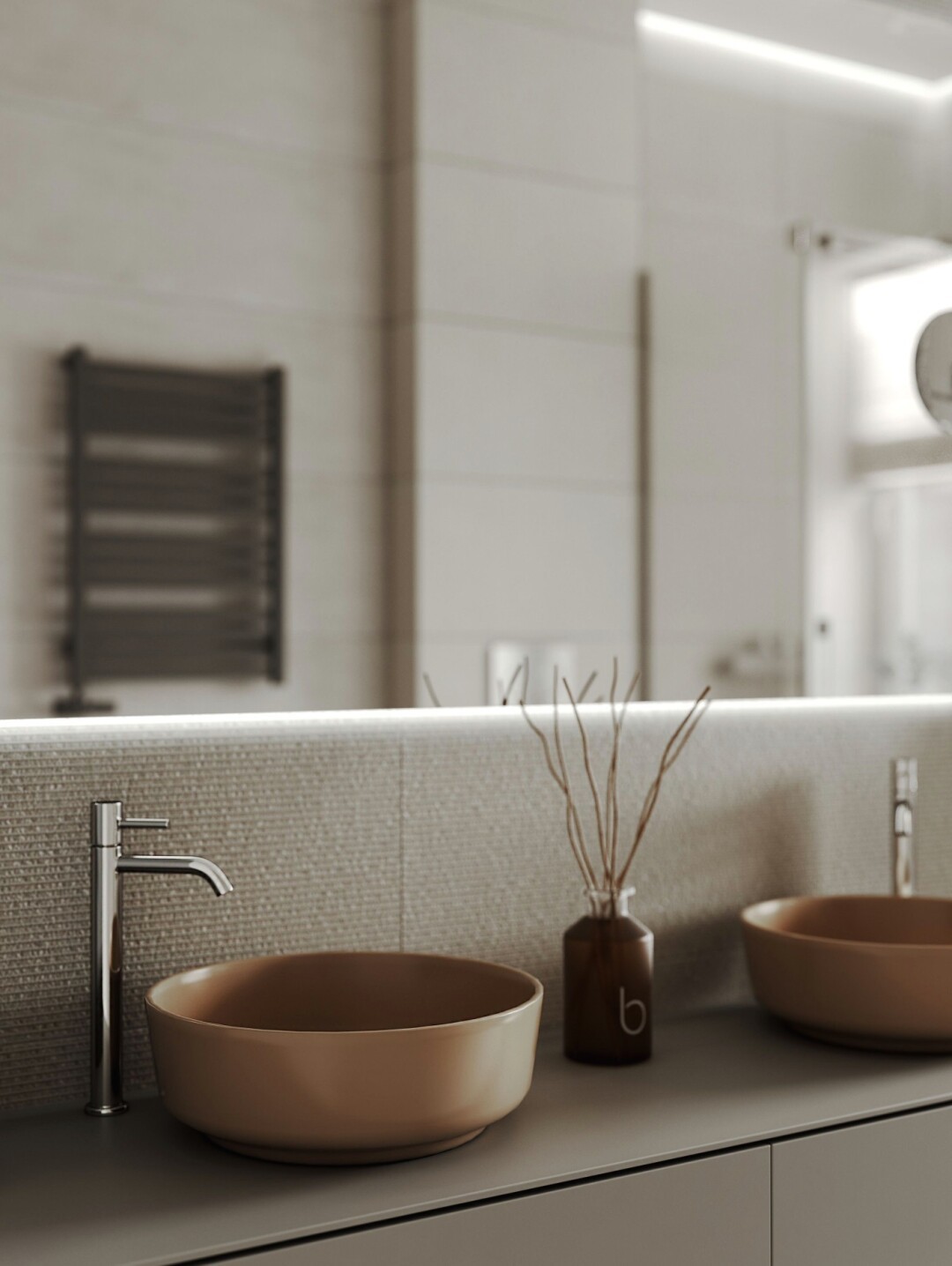 浴室选用了特殊定制的洗手台,配色跟墙体颜色相近。