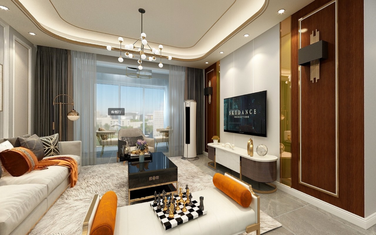 原始户型的客厅部分有一些不合理,就是客厅南侧阳台空间,为了更好的利用空间,所以设计的时候就打通了2个空间,使空间感更强,增加了休闲空间和晾晒空间,电视背景墙和吊顶部分也增加了金属线条,已达到现代轻奢效果的完整体现 。