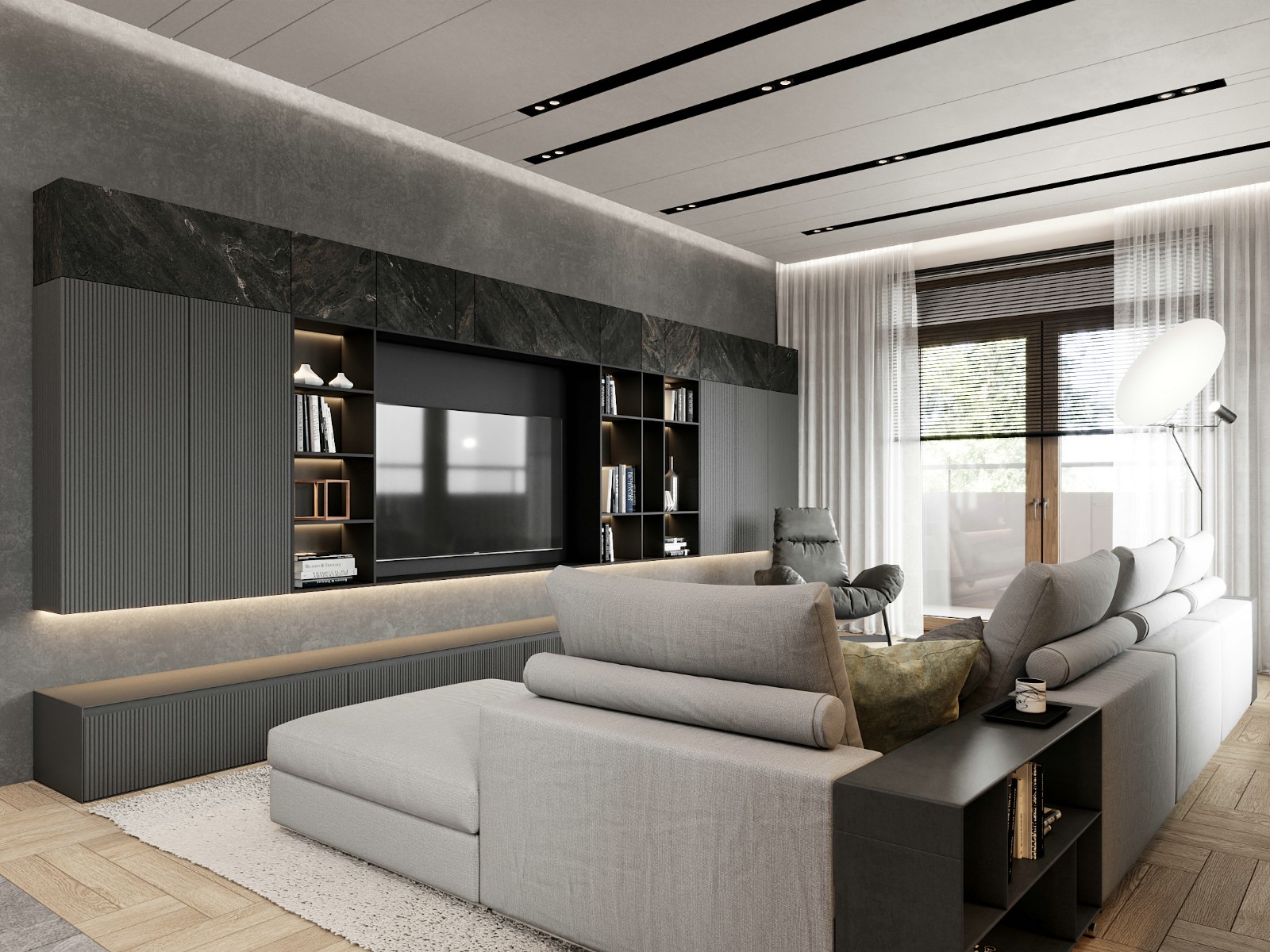 客厅以小方桌来当作茶机,整体配色简单,黑白灰黄,而电视墙则以壁柜的 形式来表达,完全可以把客厅当作书桌来使用。