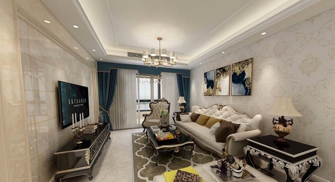 客厅背景墙为大砖上墙,配以石材线条,欧式家具和简欧的墙布配合