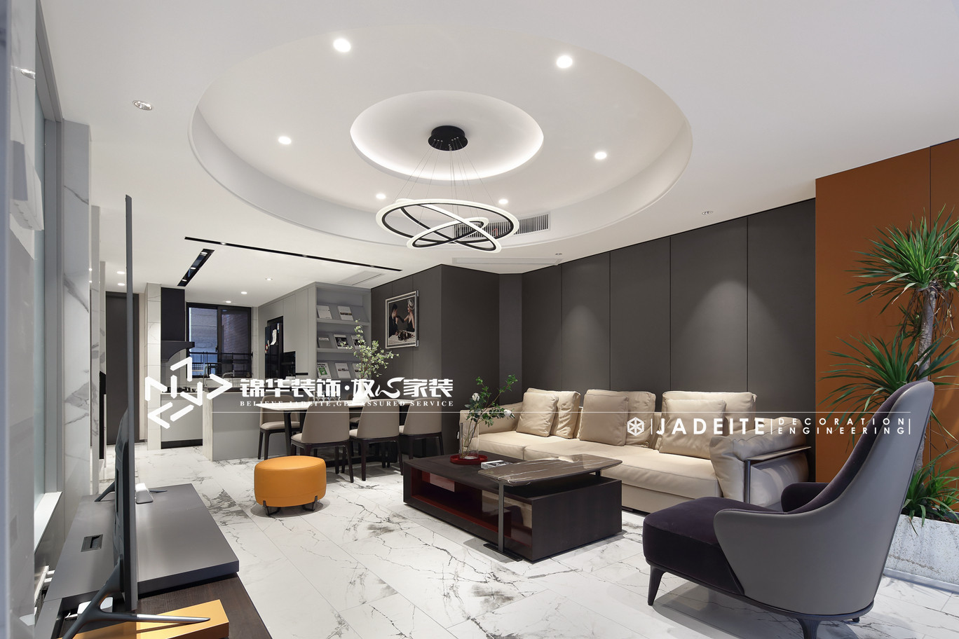 爵士白的墙地砖是空间理性的语言,构建了一个现代极简风空间,契合设计风格的特性。