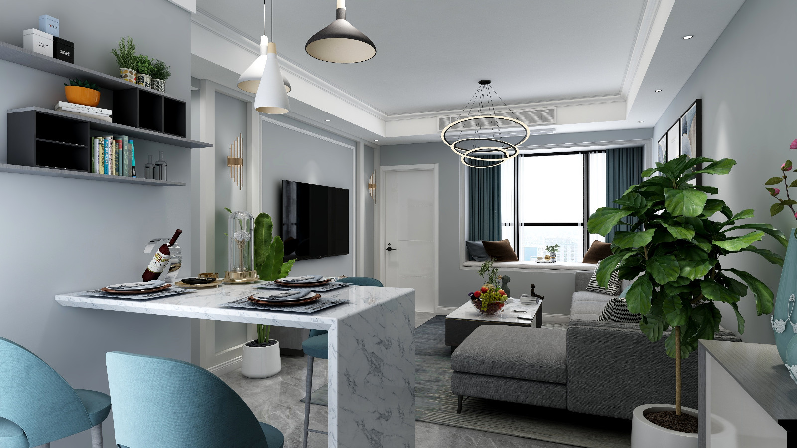 餐厅的设计,考虑尺寸问题,就没有使用常规的餐桌餐椅,而是定制的吧台,吧台宽度较常规餐桌来说小一些,作为就餐区域功能正常使用是没有问题的。