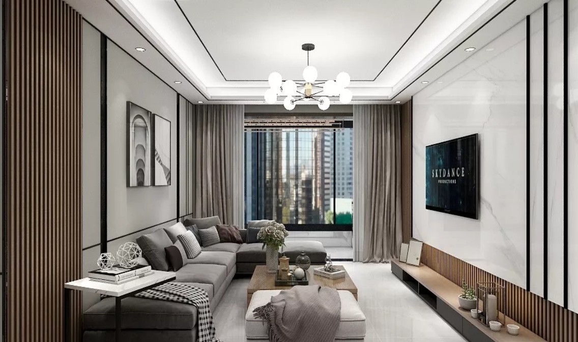 客厅的设计,墙、顶面使用的是黑色与木质线条装饰,追求现代简约的整洁、干净之美。浅灰色布艺沙发采用简约风格的款式,用几个时尚花纹靠枕来搭,体现了主人生活的轻松与自由,带给人一种舒适的感觉。