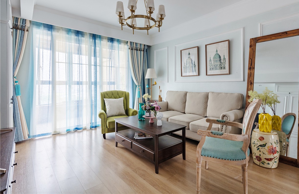 在设计过程中反复沟通,风格上女主人喜欢美式的温馨,又喜欢冷静的颜色。最终呈现出现在的样子,淡蓝色的背景下有美式的自然木色和温馨,冷暖色对比恰到好处,深受她的喜爱。