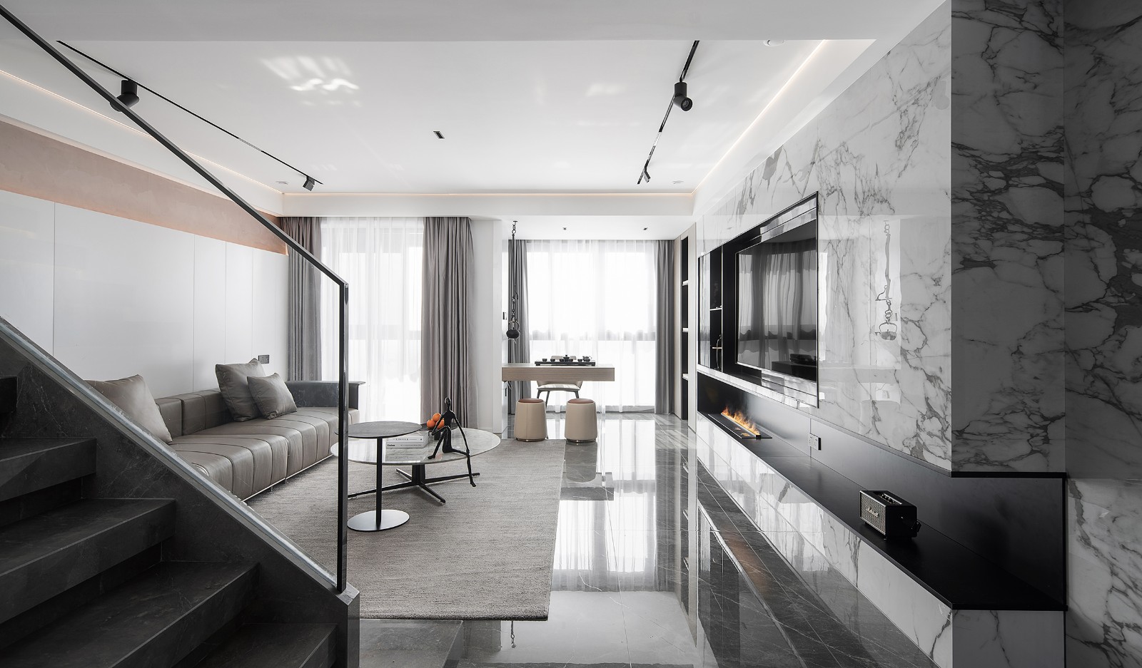 客厅布局开阔,空间顶部布置线型照明与射灯,使得上部空间简洁明亮,下部空间别具一格