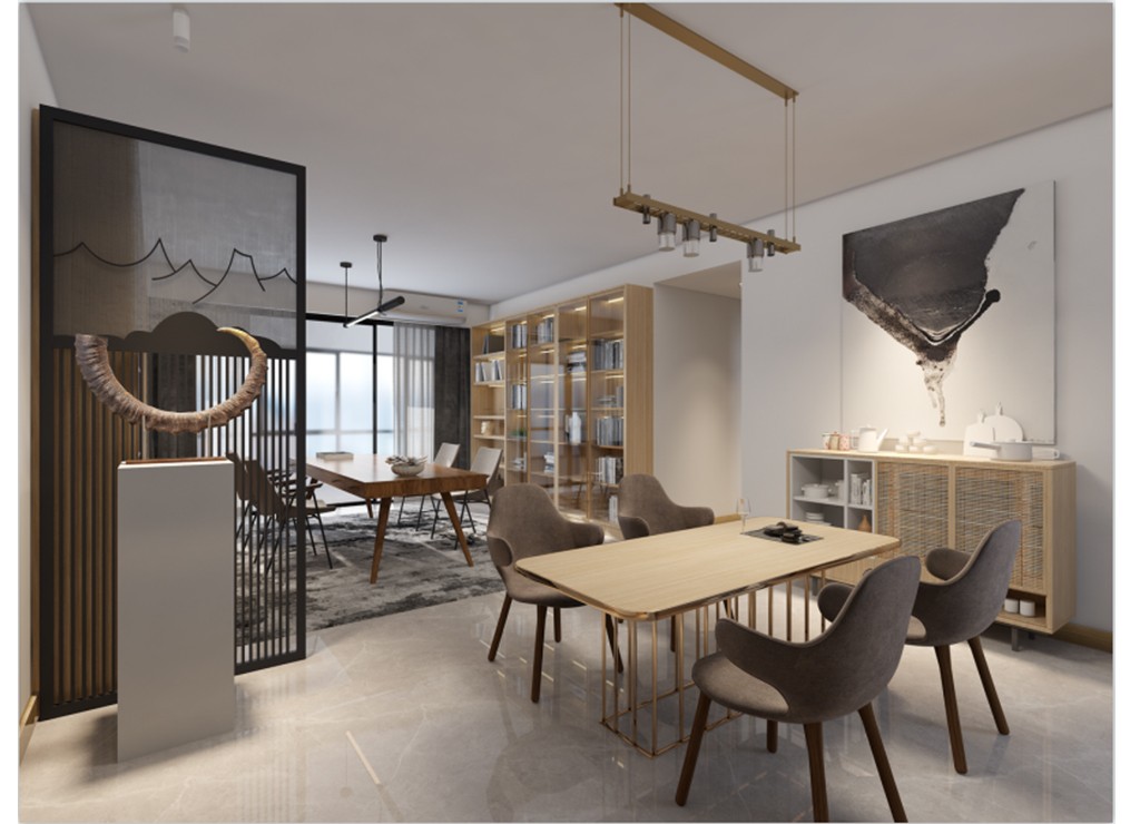 餐厅旁搭配定制屏风,,旁边配饰柜子,可以放置一些餐具,显得典雅而高端。