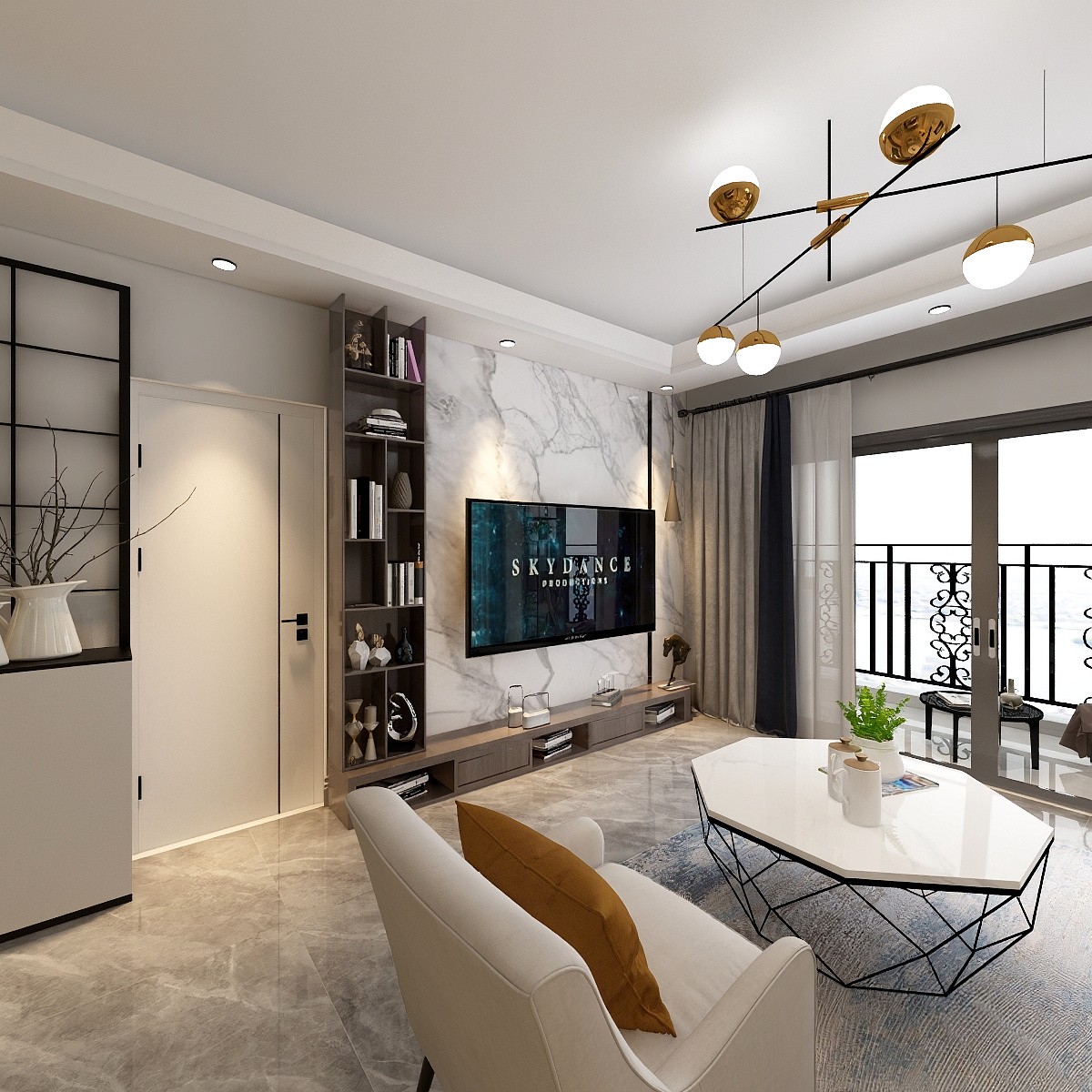 背景墙采用大理石,客厅桌面采用多边形桌子,搭配皮沙发